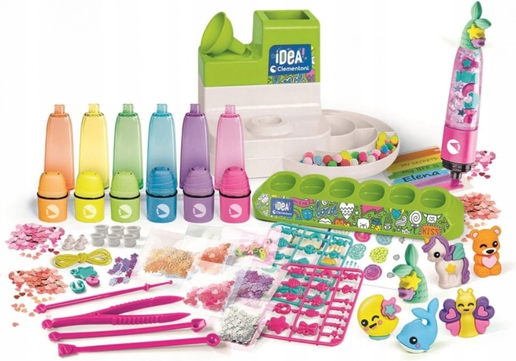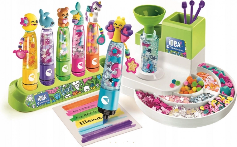 S kreativní sadou CLEMENTONI IDEA vznikne doma malá laboratoř plná barev a fantazie. Děti si samy sestaví a naplní až 6 mini zvýrazňovačů v pěti barvách, ozdobí je plovoucími dekoracemi a dotvoří samolepkami. Výsledek je efektní – originální zvýrazňovače s průhlednými nádobkami, ve kterých se po naplnění dekorace krásně vznášejí.