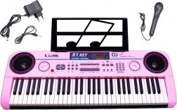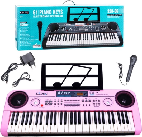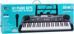 V balení najdete mikrofon, adaptér, kabel 3,5 mm a stojánek na noty – vše, co potřebujete pro okamžité hraní a zpěv.