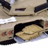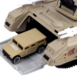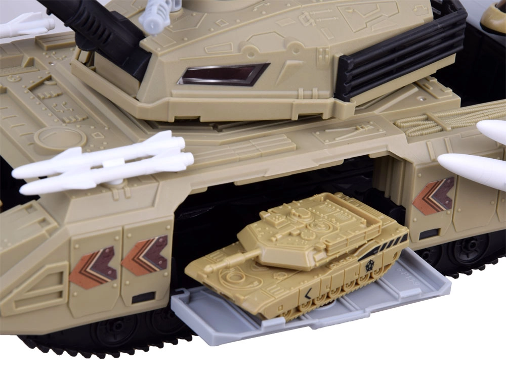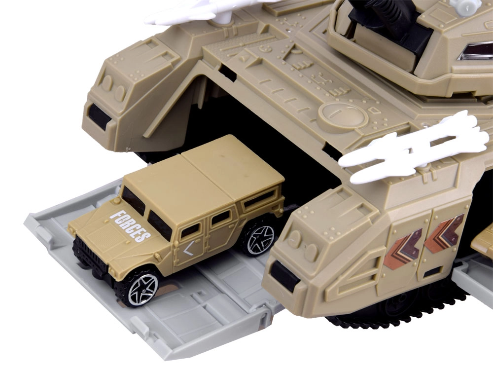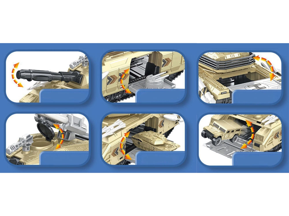 Velký tank slouží jako praktický kontejner s několika uzavíratelnými sekcemi pro uložení menších vozidel, figurek a vybavení. Děti mají vše na jednom místě a připravené k akci.