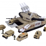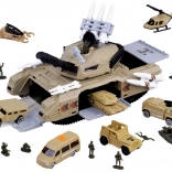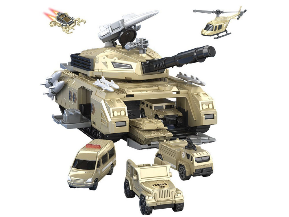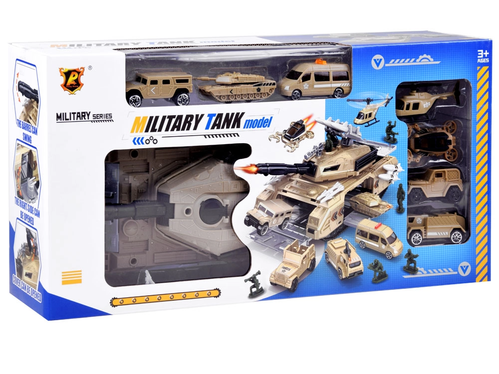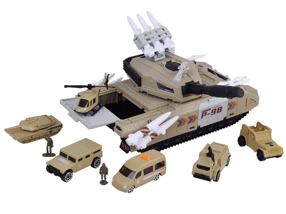 - Velký tank – garáž, mini vojenská vozidla, helikoptéra, dron, figurky vojáků, příslušenství