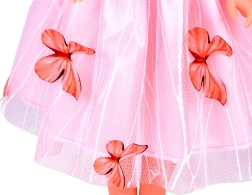 Elegantní růžové šaty s tylem a motýlími detaily dodávají panence okouzlující vzhled a inspirují k pohádkovým příběhům.
