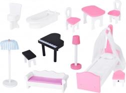 Součástí sady je postel s baldachýnem, pohovka, pianino se židlí, jídelní stůl a židle, vana, toaleta se zvedacím víkem, lampa, noční stolek a další.