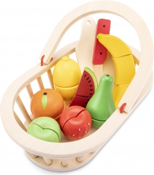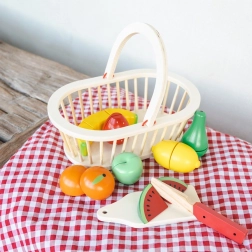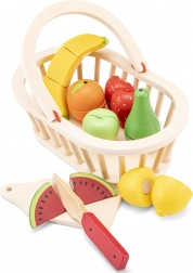 Součástí setu je prkénko, bezpečný dřevěný nůž a pestrý výběr ovoce: meloun, jahoda, hruška, jablko, citron, banán a pomeranč. Vše je uloženo v pevném dřevěném košíku, který poslouží pro snadné skladování i hraní na nakupování.