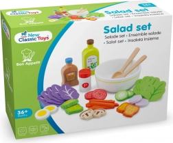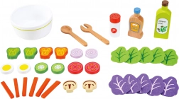 Tato realistická dřevěná sada na salát přináší dětem zábavnou možnost, jak si vyzkoušet přípravu oblíbeného jídla. V balení najdou salátovou mísu, servírovací příbory, pepřenku, lahvičky na zálivku a olivový olej i pestré ingredience: listy salátu, tyčinky mrkve, plátky hub, vajíček, okurky, rajčat, červené cibule a papriky.