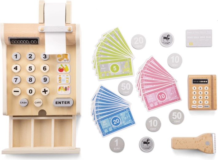 Tato dřevěná pokladna promění každý dětský pokoj v malý obchod. Děti si procvičí počítání peněz, střídání rolí prodavače a zákazníka i zdvořilou komunikaci. Díky realistickým prvkům, jako je skener, čtečka karet a otevírací zásuvka, působí hra autenticky a zábavně.