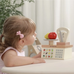 Stylová dřevěná váha pro malé obchodníky přináší zábavné učení hrou. Děti si procvičí počítání, měření hmotnosti a rolové hry s ovocem a zeleninou. Integrovaný pružinový mechanismus posouvá ukazatel podle zatížení a barevné tlačítky s čísly a obrázky podporují kreativitu a komunikaci. Ideální doplněk do dětské kuchyňky nebo obchůdku.