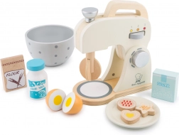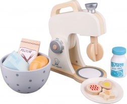 Tato nádherná dřevěná sada obsahuje realistický stojanový mixér s otočnou metlou, dřevěnou misku a bohaté příslušenství: mouku, cukr, džbán mléka, dvě půlky vajíček a talíř se třemi sušenkami. Děti mohou napodobovat pečení a přípravu dobrot jako skuteční pekaři.