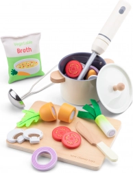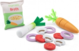 Součástí je bohatá paleta surovin: mrkev, pórek, červená cibule, plátky rajčat i hub a látkový sáček se „zeleninovým vývarem“. Děti mohou zkoušet své recepty, nabírat hotovou polévku naběračkou a servírovat ji jako skuteční šéfkuchaři.