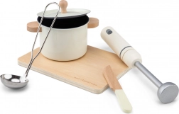 Rozviňte dětskou fantazii s kreativní sadou na výrobu polévky, která obsahuje vše potřebné pro hravou kuchařskou zábavu: kovový hrnec s pokličkou, dřevěný tyčový mixér, naběračku, bezpečný nůž, prkénko a barevnou zeleninu (mrkev, pórek, cibule, rajčata, houby) i sáček zeleninového vývaru. Hra rozvíjí jemnou motoriku, kreativitu a přirozený vztah k vaření.