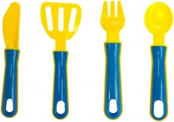 Součástí jsou plastový kráječ na pizzu a obracečka se snadným úchopem, ideální pro bezpečné a zábavné hraní bez ostrých hran.