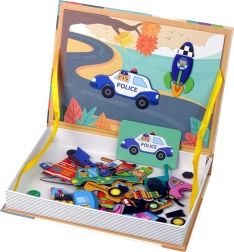 Tato magnetická skládačka v praktické knižní formě je ideální pro malé objevitele, kteří milují auta, helikoptéry a policii. Díky přehledným kartám děti poznají tvary a barvy různých silničních i záchranných vozidel a z jednotlivých dílků si je samy složí. Hra přirozeně podporuje motoriku, vizuální vnímání a kreativitu.
