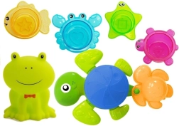 Tento bohatý set do koupele rozvíjí u dětí jemnou motoriku, smysl pro dotek a rozpoznávání barev a tvarů. Kelímky ve tvaru mořských zvířátek (rozeta, rybka, krab, želvička) mají otvory, díky nimž děti sledují a tvoří různé vodní efekty. Zelená žabka s pískátkem se stane parťákem každé koupele.