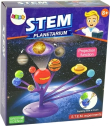 Vytvořte si malé planetárium přímo v pokoji. Sada obsahuje vše potřebné, včetně barev a štětce, k vymalování bílých planet podle vlastní představivosti. Po složení modelu a umístění planet stačí zhasnout světlo a obdivovat další funkce sady. Součástí je svítící Slunce, které uvede planety do pohybu a díky otvoru na disk můžete promítat obrázky planet na zeď.