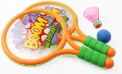 Zábavná sada pro malé sportovce: dvě dětské badmintonové rakety v oranžové a zelené barvě s motivem dinosaurů, měkký pěnový úchop pro pohodlí a jistotu, součástí je míček i košíček pro různorodou venkovní hru. Bezpečné provedení z odolného plastu, ideální pro rozvoj koordinace a aktivní zábavu na čerstvém vzduchu.