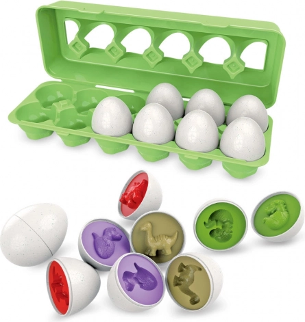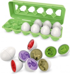 Zábavná a vzdělávací sada vajíček pro děti podporuje rozvoj jemné motoriky, rozpoznávání barev a tvarů a logické myšlení. Každé vajíčko se skládá ze dvou polovin, které do sebe pasují pouze v případě shodného tvaru a barvy. Lehké plastové provedení a praktická krabička ve stylu plata na vejce umožní vzít hračku kamkoli s sebou.