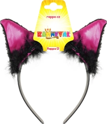 Karnevalová čelenka s kočičíma ušima v růžovo-černé barvě a peřím je ideálním doplňkem pro každou masku kočky.