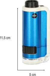 Objevte fascinující mikroskopický svět s kapesním mikroskopem pro děti. Tento přístroj umožňuje detailní prozkoumání různých objektů, jako jsou listy, textilní vlákna nebo krystaly soli, díky dvojitému zvětšení (100x, 250x). Mikroskop je vybaven LED diodou, která zajišťuje optimální osvětlení.