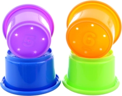 Čtyři kelímky s čísly a otvory jsou ideální pro stavění věží, učení počítání i hru s vodou. Procvičují úchop, logiku a koordinaci.