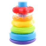 Barevné kroužky různé velikosti učí rozlišovat tvary a barvy, rozvíjejí jemnou motoriku a trpělivost při skládání na tyč.