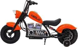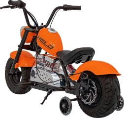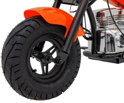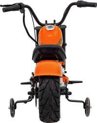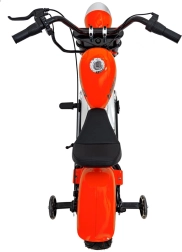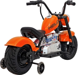 Elektrická motorka chopper Warrior v oranžové barvě nabízí dětem autentický zážitek z jízdy. Výkonný bezkartáčový motor 350 W v kombinaci s 36V bateriovým systémem poskytuje plynulé zrychlení, které je řízeno otočnou rukojetí (manetou). Široké nafukovací pneumatiky 32 × 10 cm zajišťují dobrou přilnavost i komfort, zatímco postranní kolečka pomáhají začátečníkům držet stabilitu.