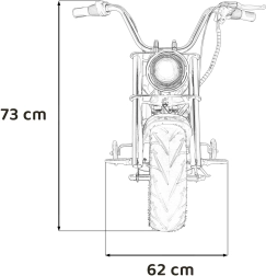 Stylová dětská elektrická motorka ve stylu chopperu potěší malé jezdce realistickým vzhledem, silným bezkomutátorovým motorem 350 W, dvojicí baterií 36 V a komfortní jízdou na pneumatikách 32 × 10 cm. Pro bezpečný start slouží tlačítko, stabilitu zajišťují postranní kolečka a o zábavu se stará LED osvětlení, audio panel s MP3/USB a imitace zvuků motoru.