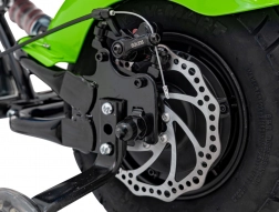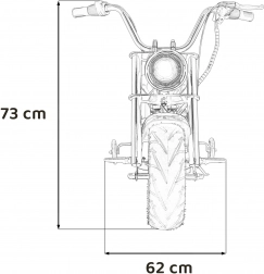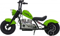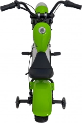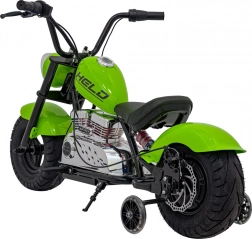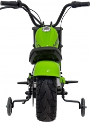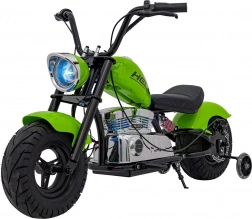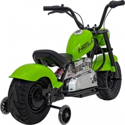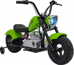 Elektrická motorka Chopper Warrior v zelené barvě je ideální pro malé jezdce, kteří chtějí zažít skutečnou radost z jízdy. Díky výkonnému 350W bezkartáčovému motoru a bateriovému systému 36 V nabídne plynulý zátah a dlouhou výdrž. Široká nafukovací kola 32×10 cm společně s tlumením a postranními kolečky přidávají stabilitu a pohodlí na různých površích.