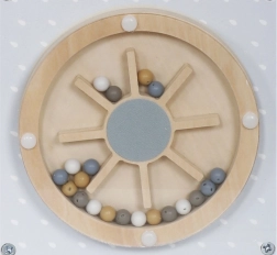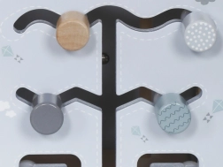 - Horní část: Obsahuje dráhy s korálky na drátěných smčkách, které pomáhají dítěti cvičit precizní pohyby rukou a soustředění.