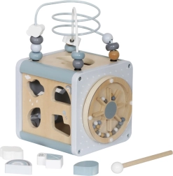 Dřevěná vzdělávací kostka nabízí mnoho atrakcí, které jistě zaujmou a okouzlí vaše dítě. Každý prvek je pečlivě navržen tak, aby dokonale padl do rukou vašeho malého průzkumníka. Pevná konstrukce ze dřeva zaručuje odolnost a jemná pastelová grafika podněcuje představivost a rozvíjí koncentraci. Pohyblivé prvky, které lze posouvat, stisknout a manipulovat s nimi, podporují rozvoj manuálních zručností a zajišťují zároveň zábavnou a rozvíjející hru.