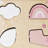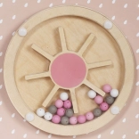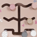 - Dřevěná konstrukce: Pevná a estetická, vyrobená z bezpečných materiálů, malovaná v umírněných pastelových barvách, které hračce dodávají elegantní vzhled a jsou přátelské k dítěti.