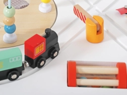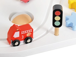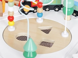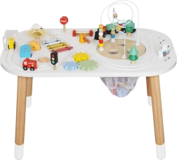 Dřevěný multifunkční stůl pro děti kombinuje vzdělávací a vývojové funkce. Je navržen tak, aby podpořil manuální dovednosti, koordinaci rukou a očí a kreativitu. Hračka umožňuje dětem prozkoumávat zvuky a rozvíjet hudební schopnosti díky xylofonu, stejně jako probouzet jejich fantazii a logické myšlení během hry s integrovanou autodráhou.