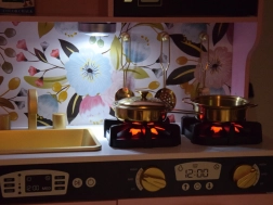 Tato kuchyně vyniká retro designem s květinovým vzorem, který se perfektně hodí do dětského pokoje a přináší jedinečný styl.