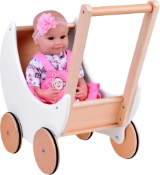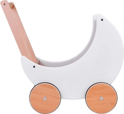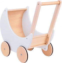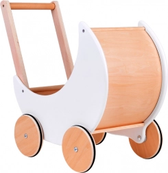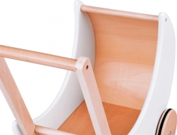 Roztomilý dřevěný vozík pro panenky je vyroben z přírodního dřeva, které je bezpečné pro děti. Jeho ergonomický úchyt je přizpůsoben malým ručkám, což podporuje rozvoj rovnováhy. Gumová kolečka chrání podlahu před poškrábáním a zajišťují tichý chod.