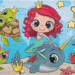 Krásné dětské puzzle s motivem mořské víly a zvířátek z podmořského světa. Obsahuje 30 velkých dílků pro snadné skládání, výsledný obrázek má rozměr 29 × 18 cm. Ideální jako první puzzle pro děti, dodáváno v dárkové krabičce s uchem pro pohodlné přenášení.