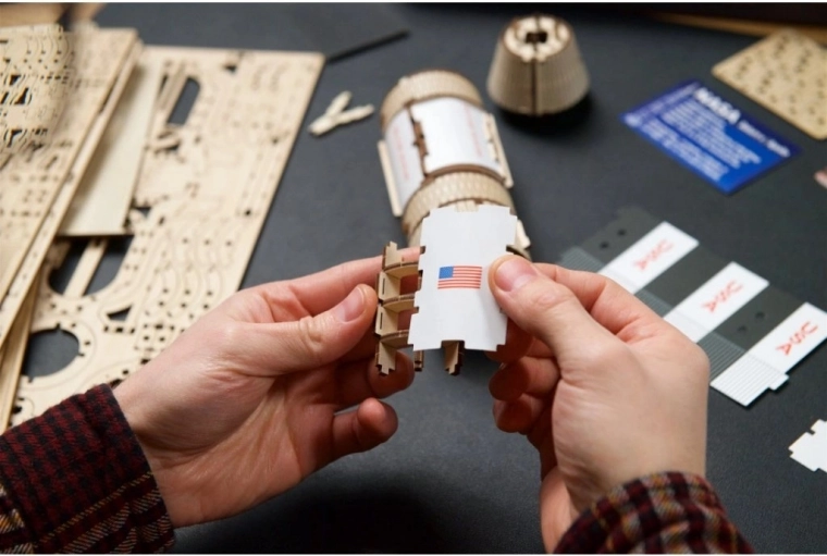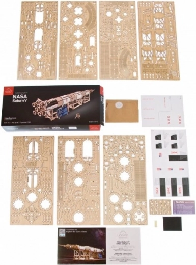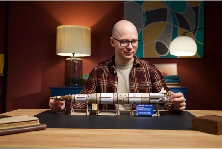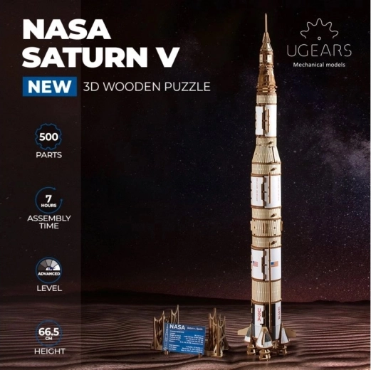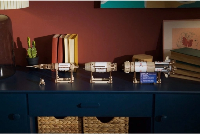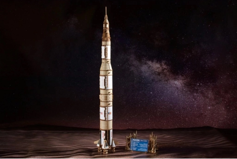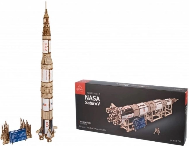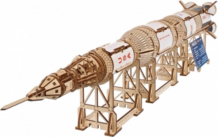 Model je vyroben z kvalitního, ekologického dřeva s precizně předřezanými díly pro sestavení bez lepidla. Díky detailnímu návodu jej zvládnou i zruční začátečníci, zatímco zkušení modeláři ocení technickou promyšlenost, mechanické prvky a propracované detaily včetně lunárního modulu.