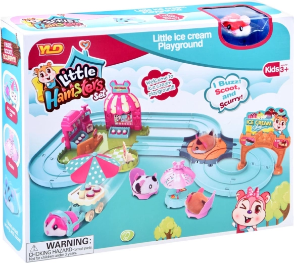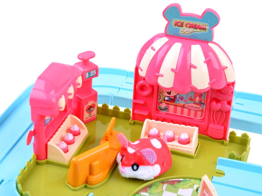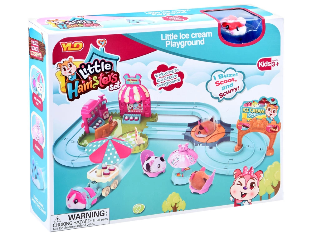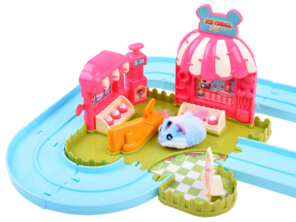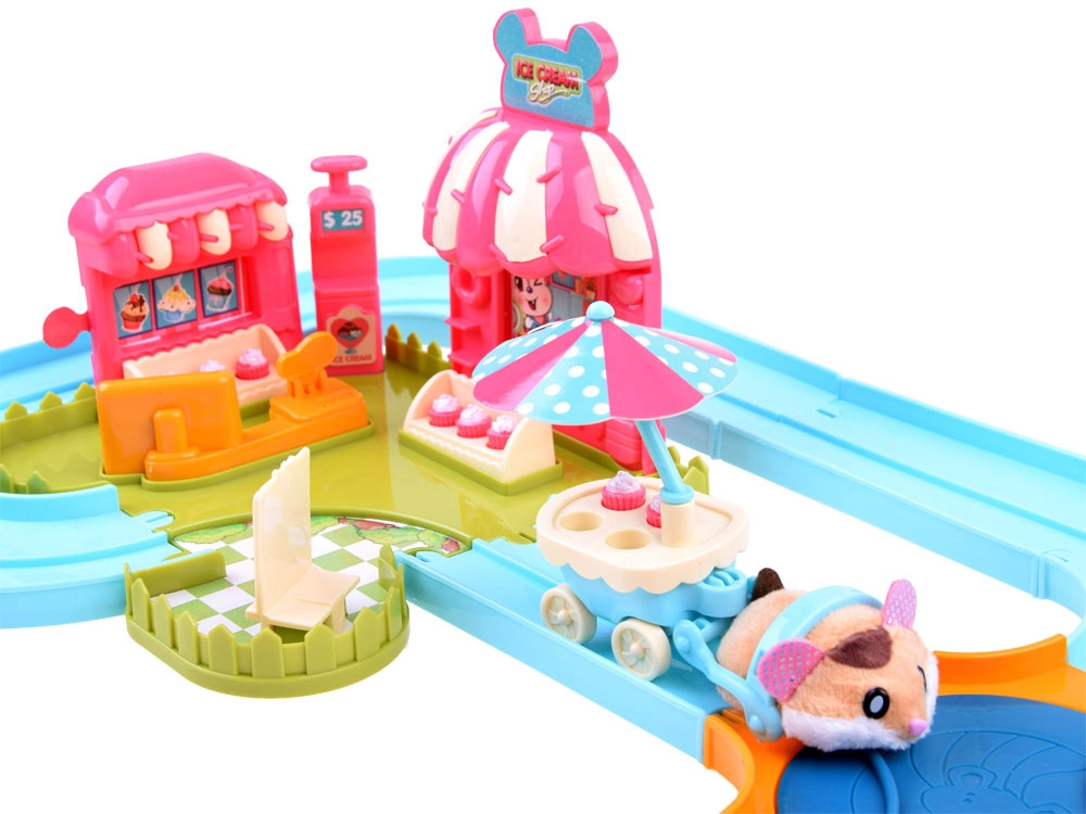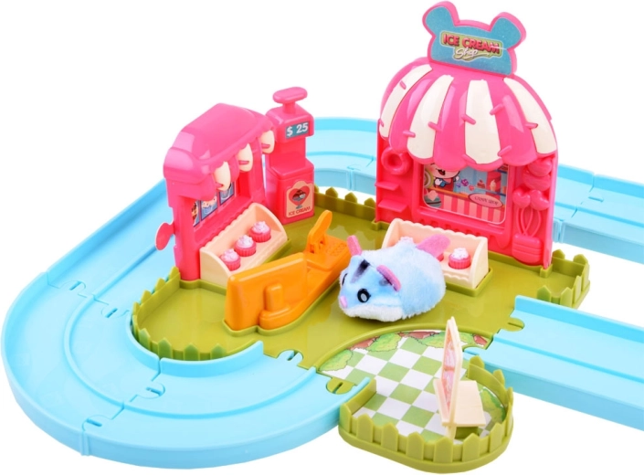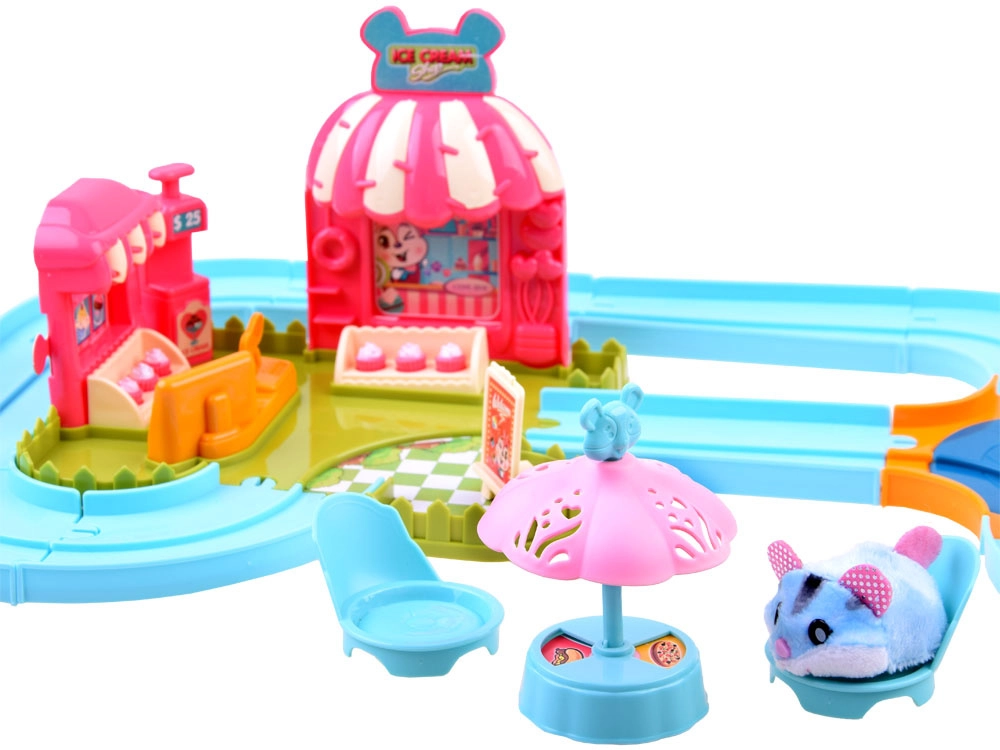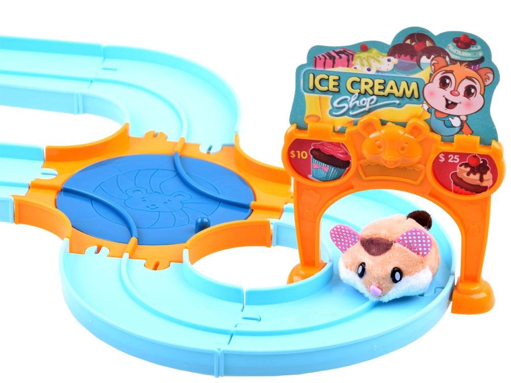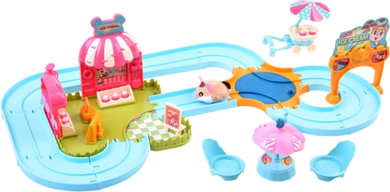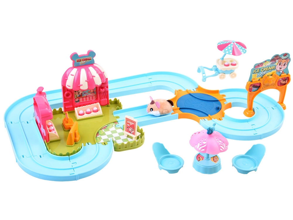 Tato hrací sada přináší zábavný svět zmrzlinárny s roztomilým křečkem, který má heboučké kožíšek a je připraven k akci hned po vybalení – napájení z baterie AG13 (součástí balení). Po zapnutí se křeček rozjede, samovolně mění směr a lze jej vést po přiložené snadno sestavitelné trati se výhybkou. S připojeným vozíčkem rozváží dobroty pro hosty.