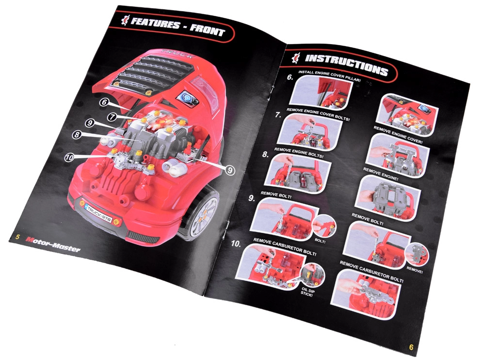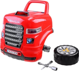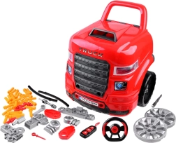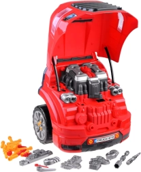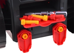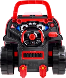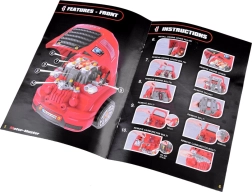 Tato přenosná autodílna v červeno‑černém provedení promění každé dítě v šikovného mechanika. Pod kapotou čeká detailně zpracovaný plastový motor, který lze rozebrat a znovu složit. V kabině najdete volant s klaksonem, páku s režimy P/R/N, tlačítko start/stop a úložný prostor na drobnosti. Přední světla svítí bíle a doprovázejí je zvukové efekty.