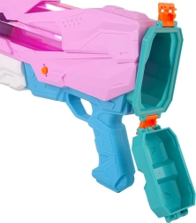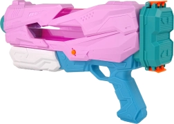 Vodní pistole přichází v poutavých barvách růžové a tyrkysové, s ergonomickým úchytem pro snadné uchopení a pohodlné hraní.