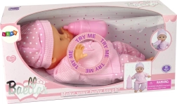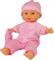 Roztomilá panenka miminko v růžovém oblečku potěší každé dítě. Po stisknutí tělíčka vydává realistické dětské zvuky jako pláč, žvatlání či „máma“. Má pohyblivé ruce a nohy, snadno svlékatelné oblečky a součástí je růžová lahvička. Bezpečná hračka s certifikací CE, napájená 3× AG13 (součástí).