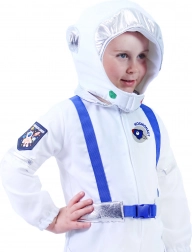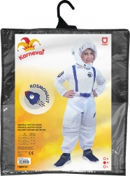 Senzační karnevalový kostým astronauta. Kostým ve velikosti M je určen pro chlapečky ve věkovém rozmezí 6-8 let (116-128 cm). Balení obsahuje bílou kombinézu se stříbrnými doplňky a látkovou sladěnou helmu. Součástí je také sladěná červená kšiltovka s českým nápisem.
