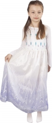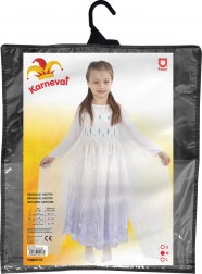 Stylový dívčí kostým zimní královna přináší pohádkový vzhled díky kombinaci bílé barvy, fialových tónů a třpytu. Horní díl je zdoben flitry, od pasu se rozvíjí vzdušná tylová sukně s jemným potiskem a celkový dojem podtrhuje vlečka s dekoracemi.