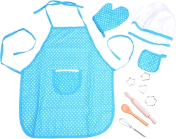 Zástěra, čepice, rukavice, podložka a pečicí nástroje v jednom balení – vše, co dítě potřebuje pro hravé i skutečné vaření.