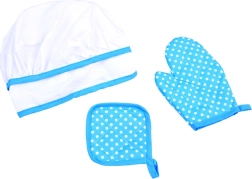 Čepice na gumičku, zástěra s kapsou a tepelná rukavice s podložkou chrání oblečení i ruce a děti se cítí jako opravdoví kuchaři.