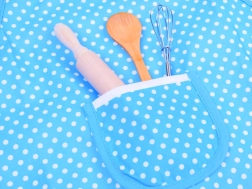 - Zástěra, kuchařská čepice, rukavice, textilní podložka, dřevěný váleček, dřevěná lžíce, kovová metlička, 4 kovová vykrajovátka