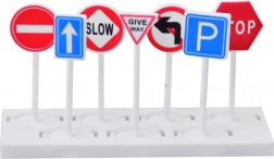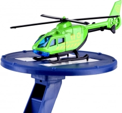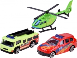 - Kompletní set: 2 kovová autíčka, helikoptéra, 7 dopravních značek, samolepky, městská podložka.