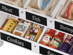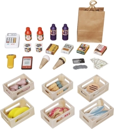 Set obsahuje pokladnu s platebním terminálem, čtečku, hráčské peníze, dřevěné bedýnky s potravinami, papírovou tašku, zvonek i dekorativní samolepky. Děti si osvojí základy počítání, finanční gramotnosti a spolupráce, zároveň si procvičí psaní a čtení na křídových tabulkách.