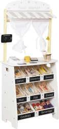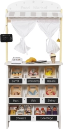 Dřevěný stánek s markýzou a přihrádkami na potraviny nabízí dětem autentický zážitek z nakupování: třízení ovoce a zeleniny, psaní křídou na tabulky i markování přes pokladnu se čtečkou. Po otočení či uzavření bočnic se promění v půvabné divadélko s oponou – ideální pro první příběhy a představení.