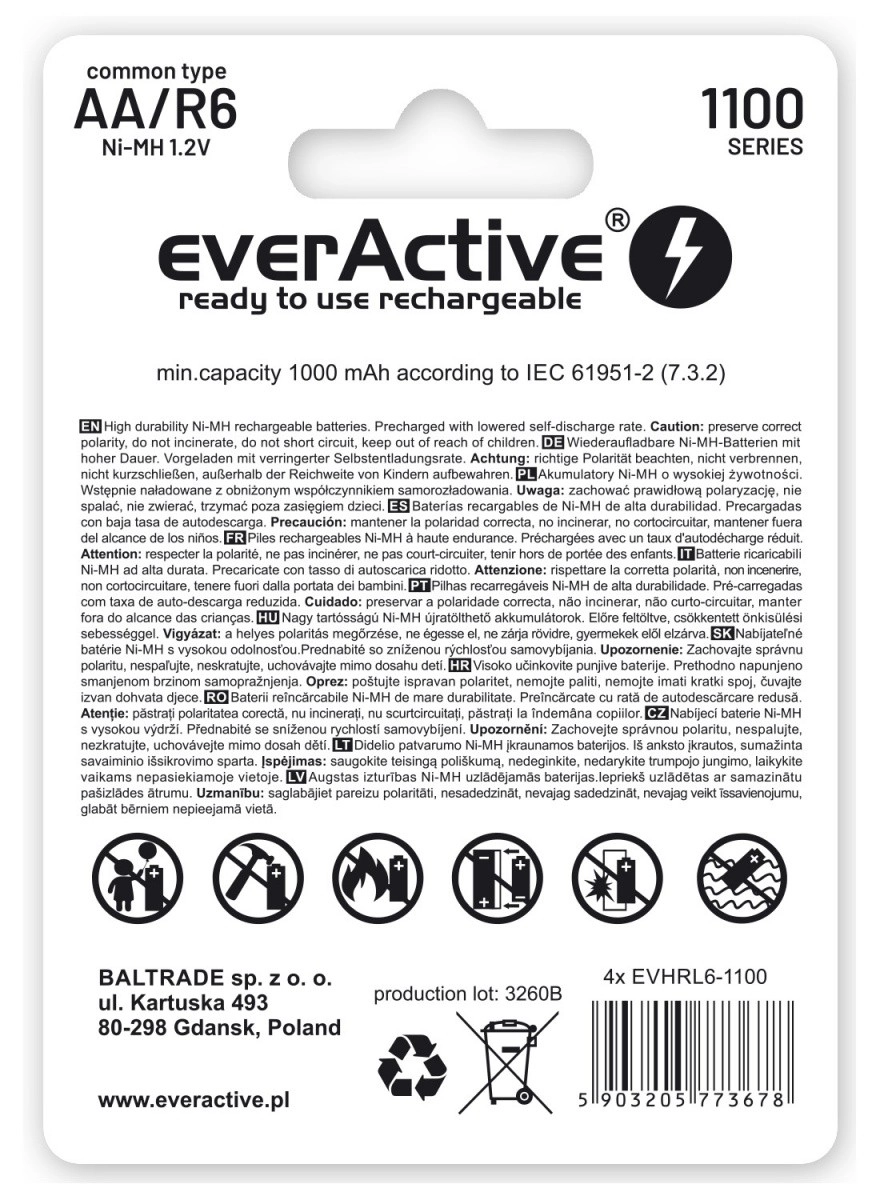 Objevte inovativní akumulátory R6 AA 1100 mAh značky EverActive, které jsou součástí řady Infinity Line. Tyto nabíjecí baterie byly vyvinuty s technologií "ready to use", což znamená, že jsou přednabité a připravené k okamžitému použití: