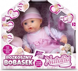 Interaktivní miminko s doplňky Natalia Collection je jako opravdové: reaguje na dotyk a pohyb, vydává realistické zvuky (smích, pláč, spánek), říká „mama“ a „tata“ a po krmení z lahvičky si odříhne. Měkké tělíčko, dudlík a polštářek v balení – ideální hračka pro děti od 2 let.