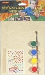 - Dřevěné dílky, barvy, štětec, sada obtisků