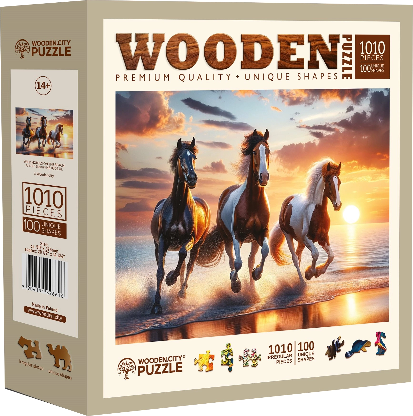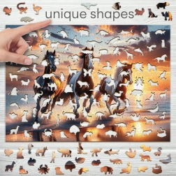 Vstupte do světa kvalitních dřevěných puzzlí s motivem divokých koní na pláži. WOODEN CITY přináší laserem vyřezávané dílky z pevné HDF desky o síle 3–4 mm, které se vyznačují hladkými hranami a dlouhou životností. Část dílků je ve tvaru zvířat a díky jemným detailům může sloužit i jako drobné figurky.